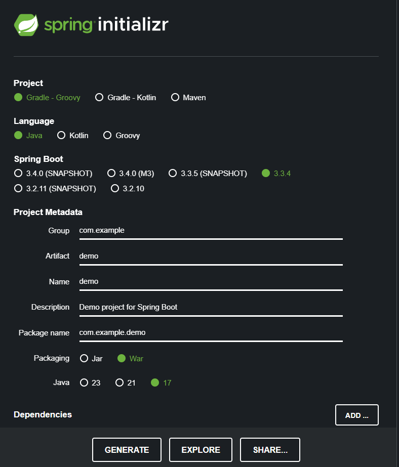 https://start.spring.io/ 로 이동하여 프로젝트를 설정한다. 여기서 기본설정을 하고 만들어서 넘어갑니다.